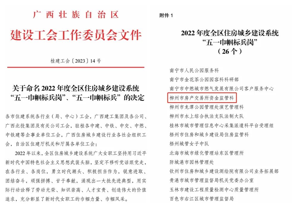 6月2日上午,2022年度全区住房城乡建设系统劳动和技能竞赛总结表彰大会在南宁召开。大会宣读了系列表彰文件,并对获奖集体及个人进行颁奖。柳州市住房和城乡建设局直属单位柳州市房产交易所资金监管科获评为2022年度全区住房城乡建设系统“五一巾帼标兵岗”。