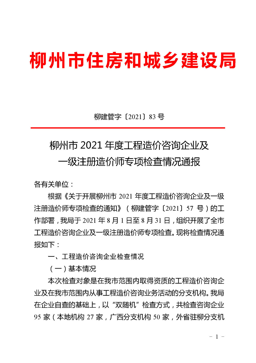 关于柳州市2021年度工程造价咨询企业及注册造价工程专项检查情况通报